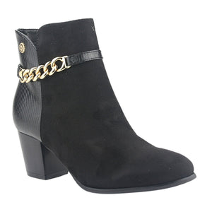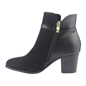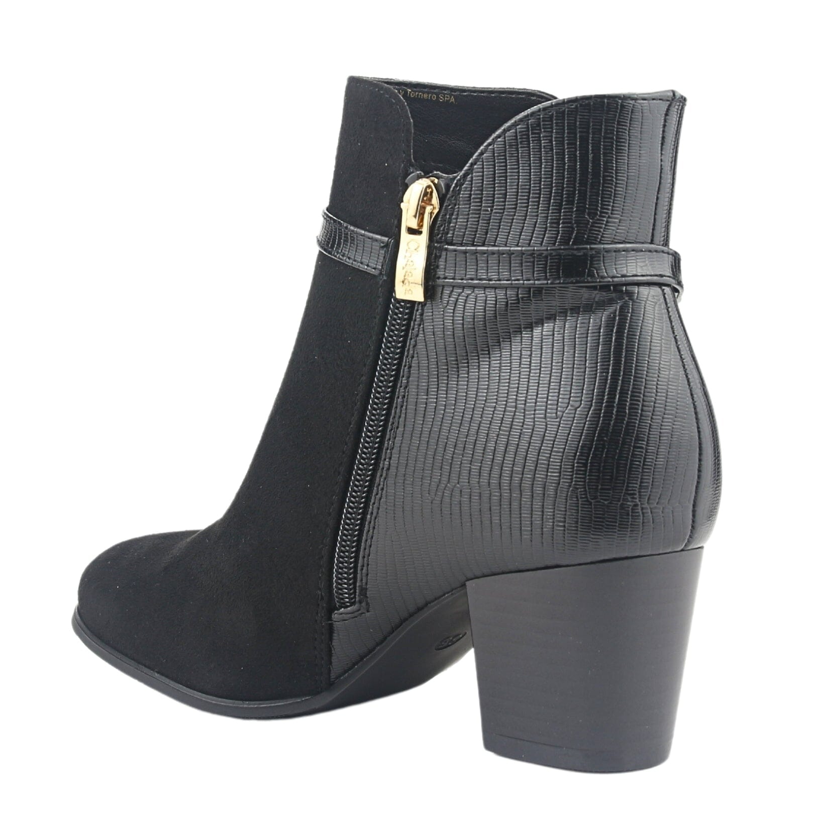 Botin Mujer Casual Costa-1 Color Negro de Capellada Sintetico con Forro Textil y Planta de Goma, su Taco mide 6 cm aprox, su Plataforma No Aplica, su Caña 13 cm aprox, Contorno de pantorrilla 29 cm aprox y su Tipo de Cierre es Cierre