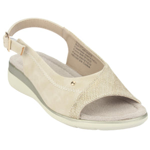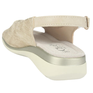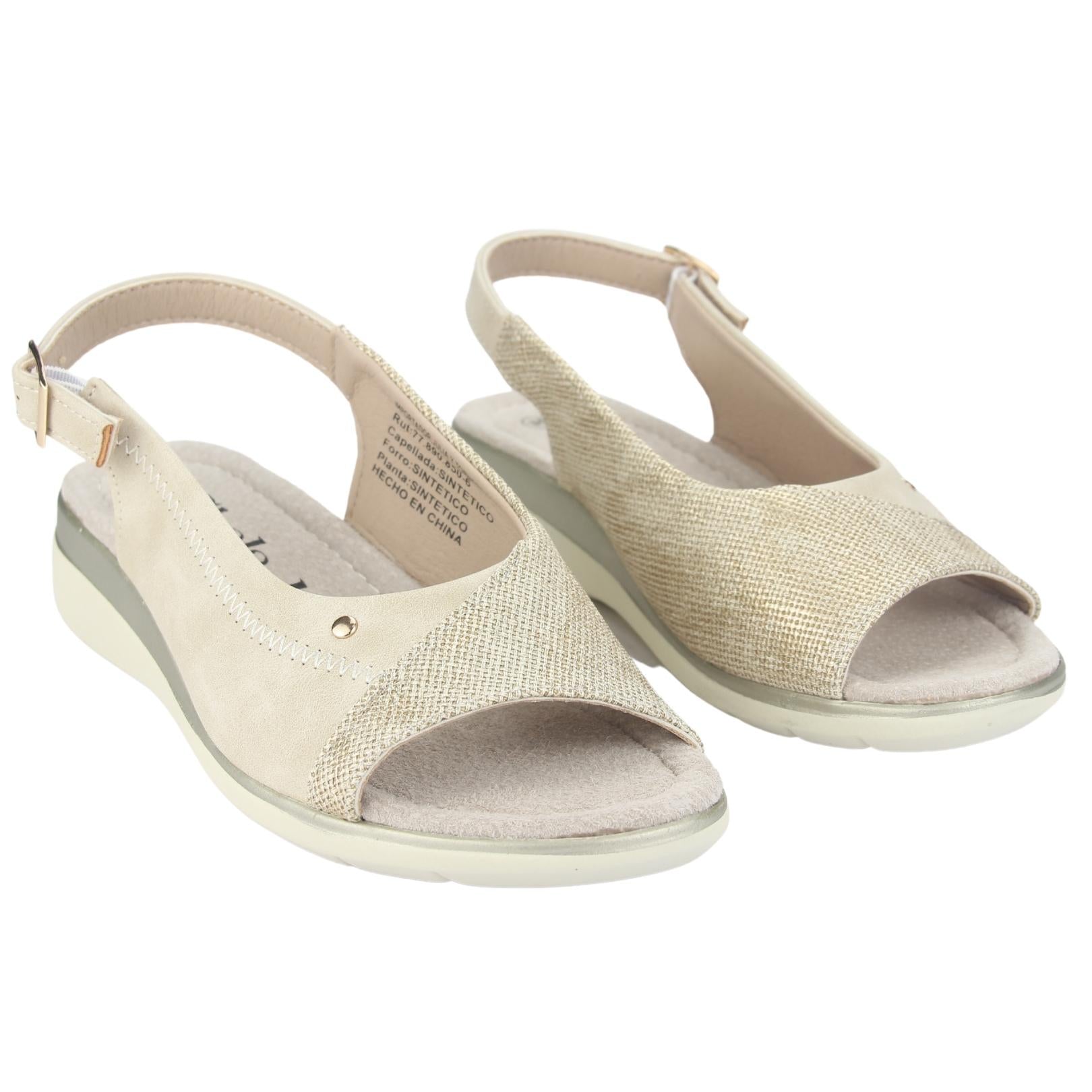 Sandalia Mujer Casual Floro-5 Color Beige de Capellada Sintetico con Forro Sintetico y Planta de Goma, su Taco mide 3 cm aprox y su Tipo de Cierre es Hebilla
