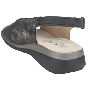 Sandalia Mujer Casual Floro-5 Color Negro de Capellada Sintetico con Forro Sintetico y Planta de Goma, su Taco mide 3 cm aprox y su Tipo de Cierre es Hebilla