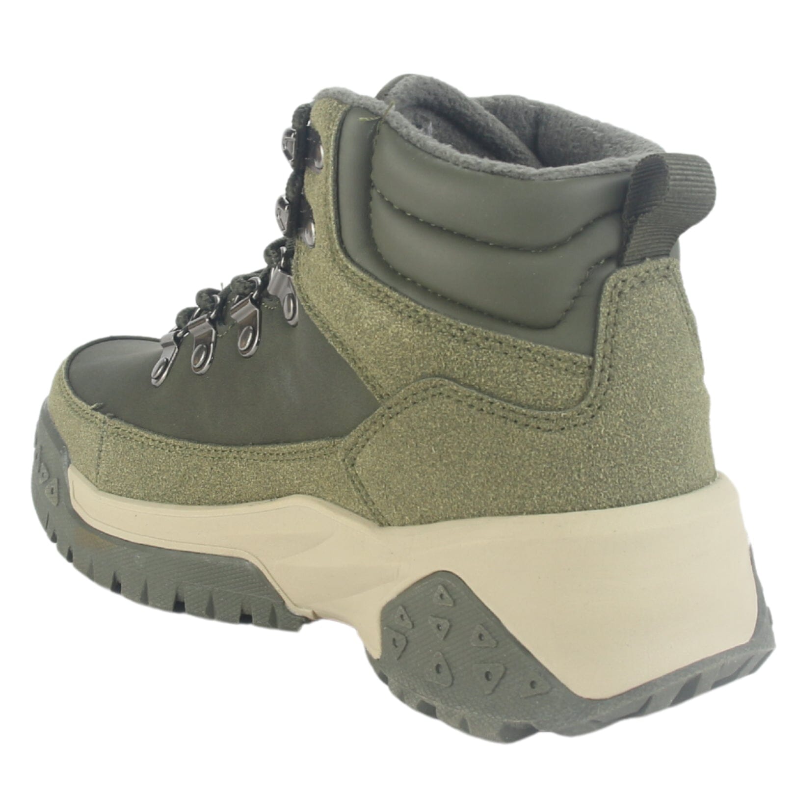Botin Funway Mujer Nevado-2 Oliva Outdoor de Capellada Sintetico con forro Textil y planta de Goma y su Taco mide 6 cm aprox, la altura de su caña es de 8 cm aprox, el contorno de su bota es de 30 cm aprox