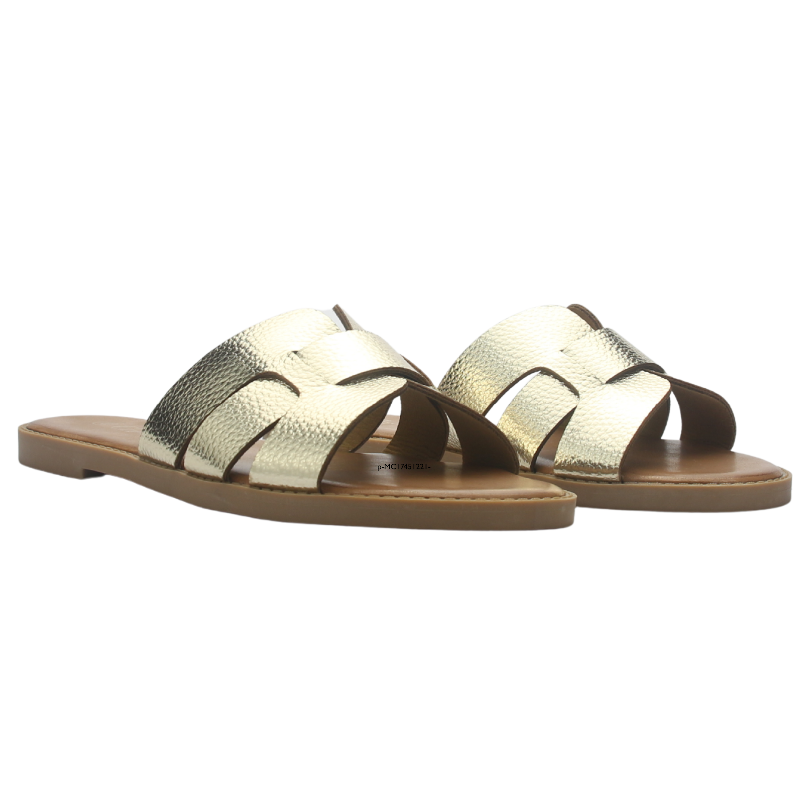 Sandalia de Mujer de color Dorado con un estilo Casual, Marca Chalada el material de su capellada es sintetica, al igual que, su interior, su ajuste es abierto, su capellada tiene un acabado metalizado, ademas la altura de su plataforma es de 5 cm