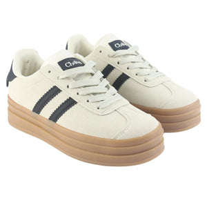 Zapatilla Chalada Mujer Andy-12 en color beige, una propuesta urbana y versátil que combina comodidad con estilo contemporáneo. Su plataforma de 3 cm brinda una elevación sutil que favorece la silueta sin perder estabilidad, perfecta para el día a día en la ciudad.