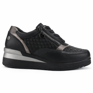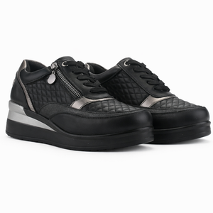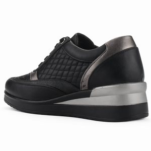 Zapatilla Negro Mujer Danay se caracteriza por tener un estilo Urbano, el material de su capellada es sintetica, y el de su interior es textil, ademas la altura de su plataforma es de 6cm, su caña es baja y ademas el contorno de su pantorrilla es estandar